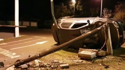 Carro fica destruído após condutor bater em postes no lago municipal