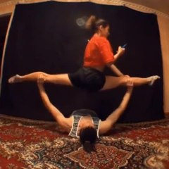 This guy did weight lifting uniquely. Instead of using a traditional barbell, he lifted a girl who was doing a split. As he hustled, the girl casually used her phone in the air.