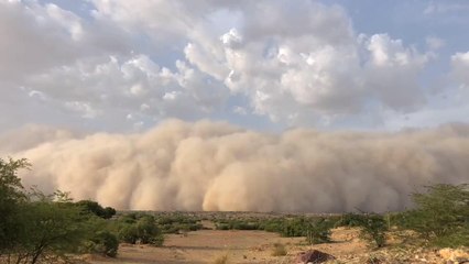 A massive sandstorm hit a village near Jaisalmer in India. Such storms are a common occurrence in the region during the monsoon season. A huge balloon of smoke swept the land as the storm made its way towards the village.