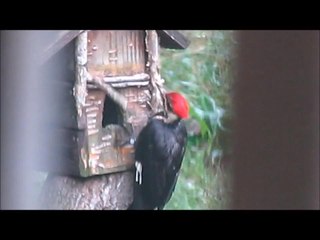 This pileated woodpecker didn’t look pleased with the birdhouse installed on a tree. It pecked at it aggressively, wrecking the front of the birdhouse as the amused owner watched the bird in action.