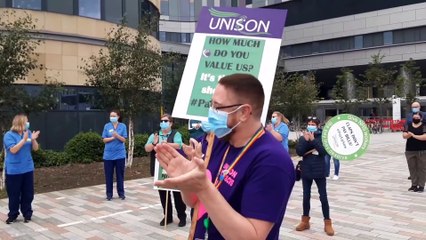 GLASGOW, SCOTLAND - AUGUST 18: NHS nurses stage a protest outside Queen Elizabeth University Hospital after being left out of a public sector pay rise on August 18, 2020 in Glasgow, United Kingdom. NHS staff across Scotland are protesting today demanding an early salary increase after they were not included in the government’s above-inflation coronavirus pay rise for public sector workers because of a three-year pay deal negotiated in 2018