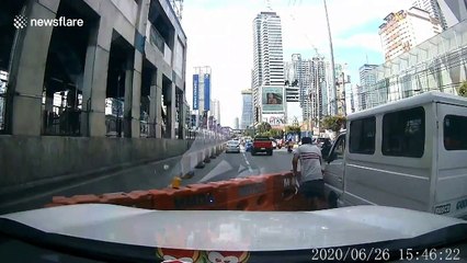 The orange barriers were installed in Mandaluyong City in Manila in the Philippines to help with traffic flow.